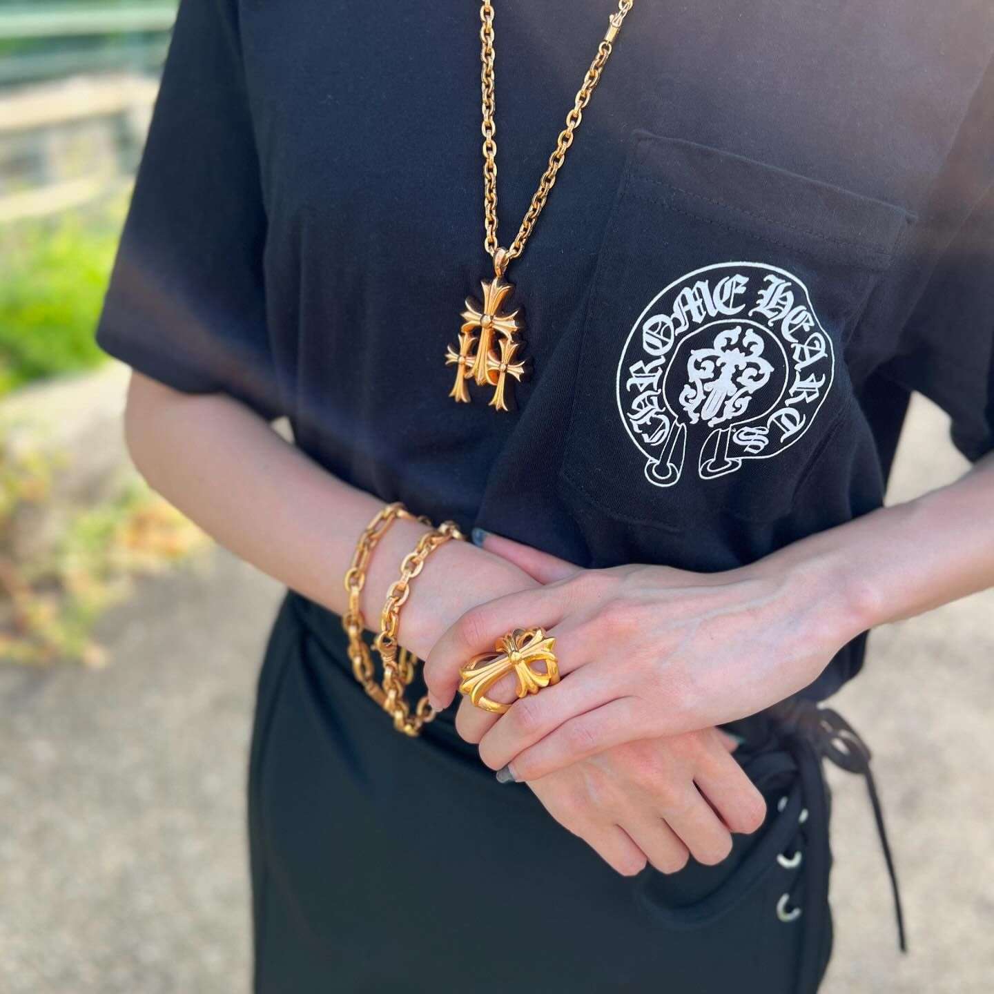 クロムハーツのネックレスは、シルバー、ゴールド、レザーなどさまざまな素材で作られています。シルバーは経年変化により独特の風合いが増していきます。ゴールドは高級感があり、華やかな印象です。